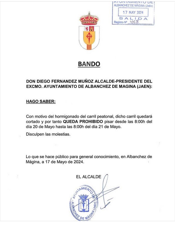 Saludos desde el Ayuntamiento de Albanchez de Mágina. En el bando informativo del día 17-05-2024 se informa que queda prohibida la circulación por el carril peatonal desde las 8:00 del día 20 de mayo hasta las 8:00 del día 21 de mayo.