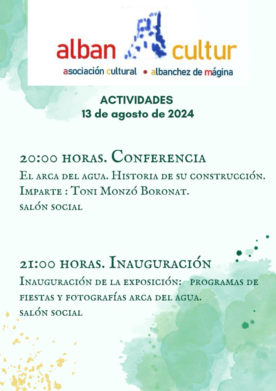 Saludos desde el Ayuntamiento. La asociación Albancultur, en colaboración con el Ayuntamiento, va a realizar en nuestro municipio una exposición sobre los programas de fiestas en el pueblo. Ademas se realizara un charla informativa sobre el Arca del agua.