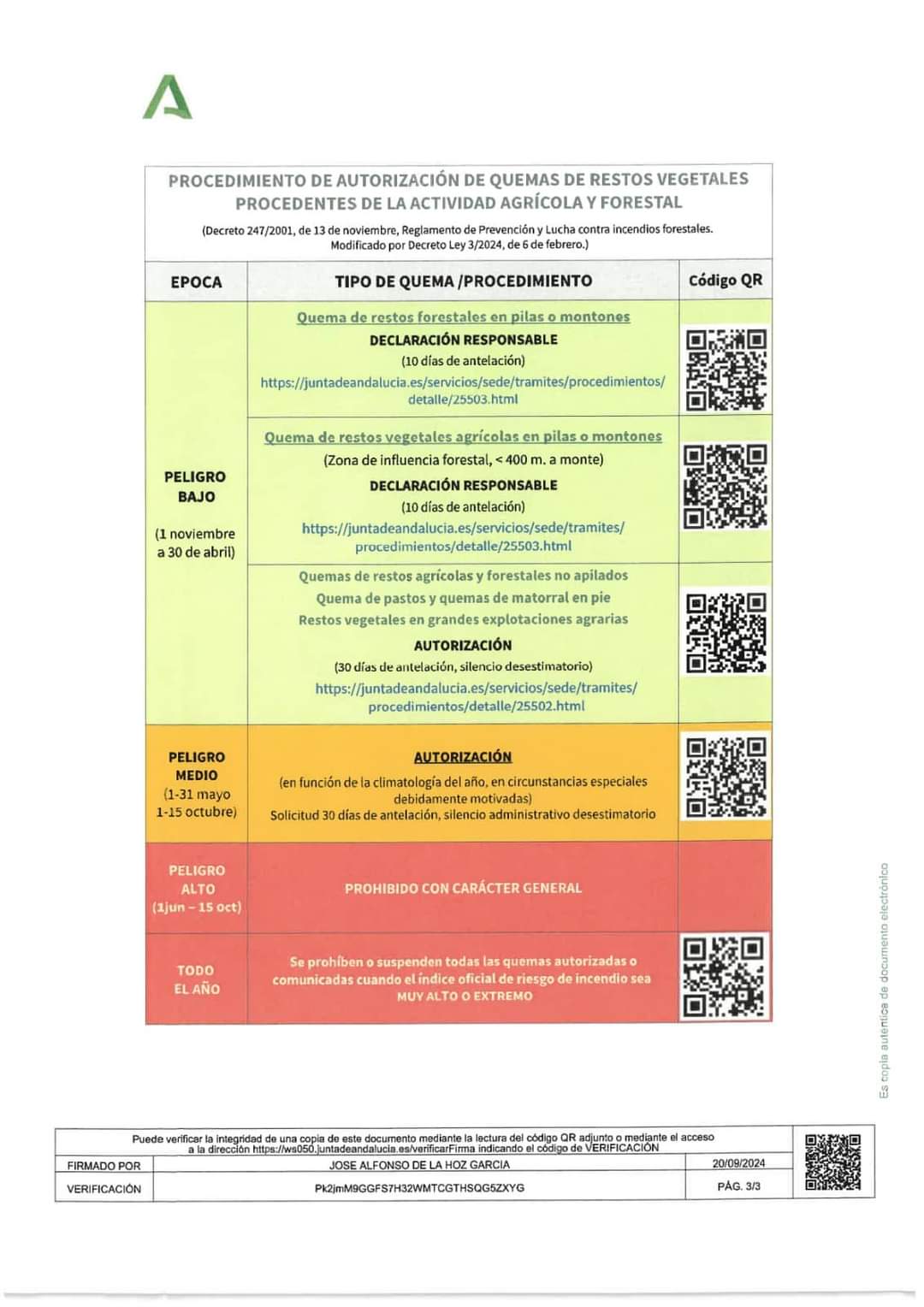 Saludos desde el Ayuntamiento. Ya se puede solicitar el permiso de quema para actividades agrícolas. Se puede solicitar en el ayuntamiento, llevando la relación de fincas con su polígono y parcela. Recordar que se debe de realizar con 10 días de antelación a la quema y que el permiso es a partir del día 1 de Noviembre. Adjuntamos PDF: