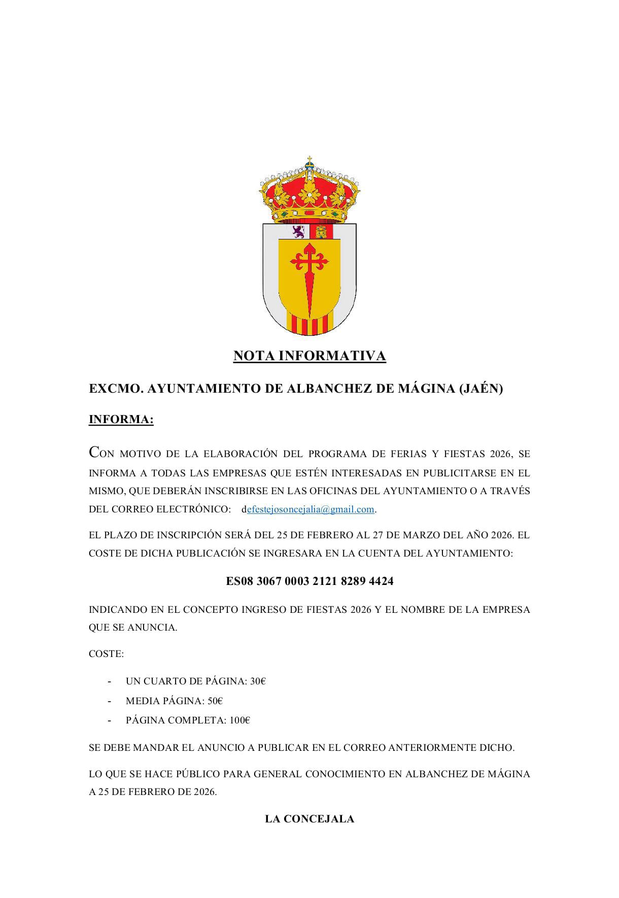 CON MOTIVO DE LA ELABORACIÓN DEL PROGRAMA DE FERIAS Y FIESTAS 2026, SE INFORMA A TODAS LAS EMPRESAS QUE ESTÉN INTERESADAS EN PUBLICITARSE EN EL MISMO, QUE DEBERÁN INSCRIBIRSE EN LAS OFICINAS DEL AYUNTAMIENTO O A TRAVÉS DEL CORREO ELECTRÓNICO: defestejosoncejalia@gmail.com.