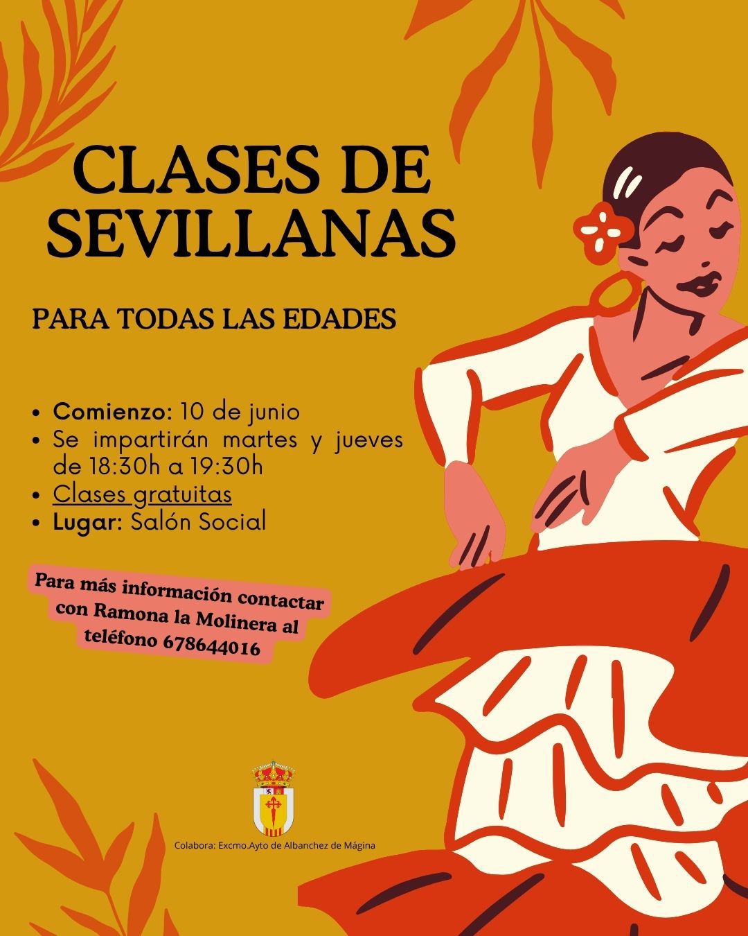 Saludos desde el Ayuntamiento. Se informa de que se van a realizar clases gratuitas de sevillanas en el municipio. Empezaran a partir del 10 de Junio. Por lo que os animamos a participar.