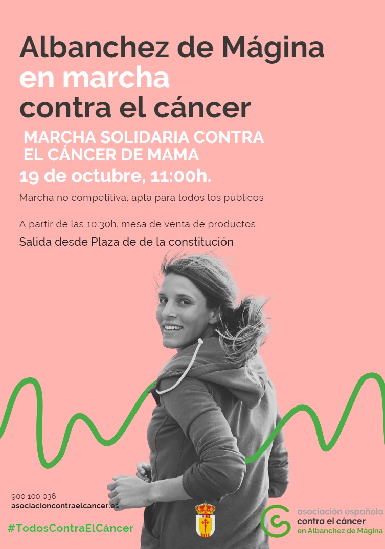 Saludos desde el Ayuntamiento. Este sábado se celebrara una marcha solidario contra el cáncer de mama. Empezara a las 10:30 desde la Plaza de la Constitución. ¡Os esperamos!