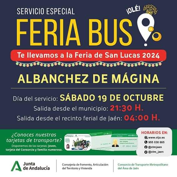 Saludos desde el Ayuntamiento. El día Sábado 19 de Octubre se habilitara un autobús desde el municipio hasta la Feria de Jaén. Los horarios son a las 21:30 para la salida, y a las 4:00 para la vuelta.