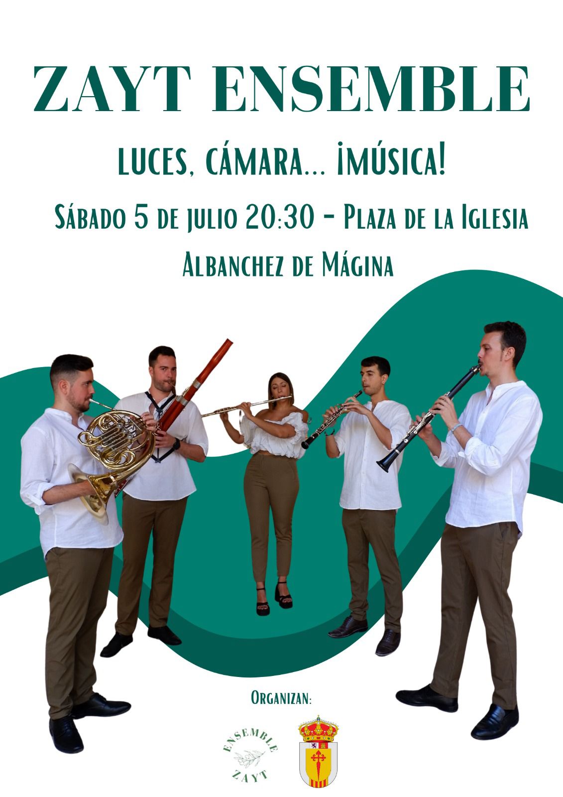 Saludos desde el Ayuntamiento. Este sábado tenemos cita un año más con este magnífico quinteto de viento. Empezamos a amenizar las noches de verano y esperamos que disfrutéis mucho.