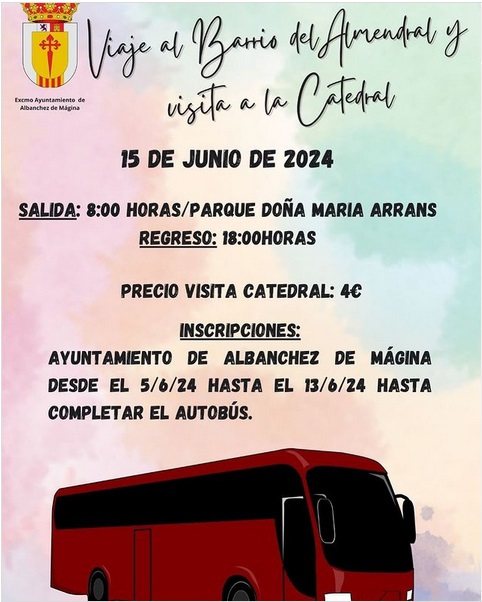 Saludos desde el Ayuntamiento de Albanchez de Mágina. Se informa a los vecinos que se va a realizar un viaje turístico a la capital de nuestra provincia. Características: ▪️El próximo día 15 de junio se va a realizar […]