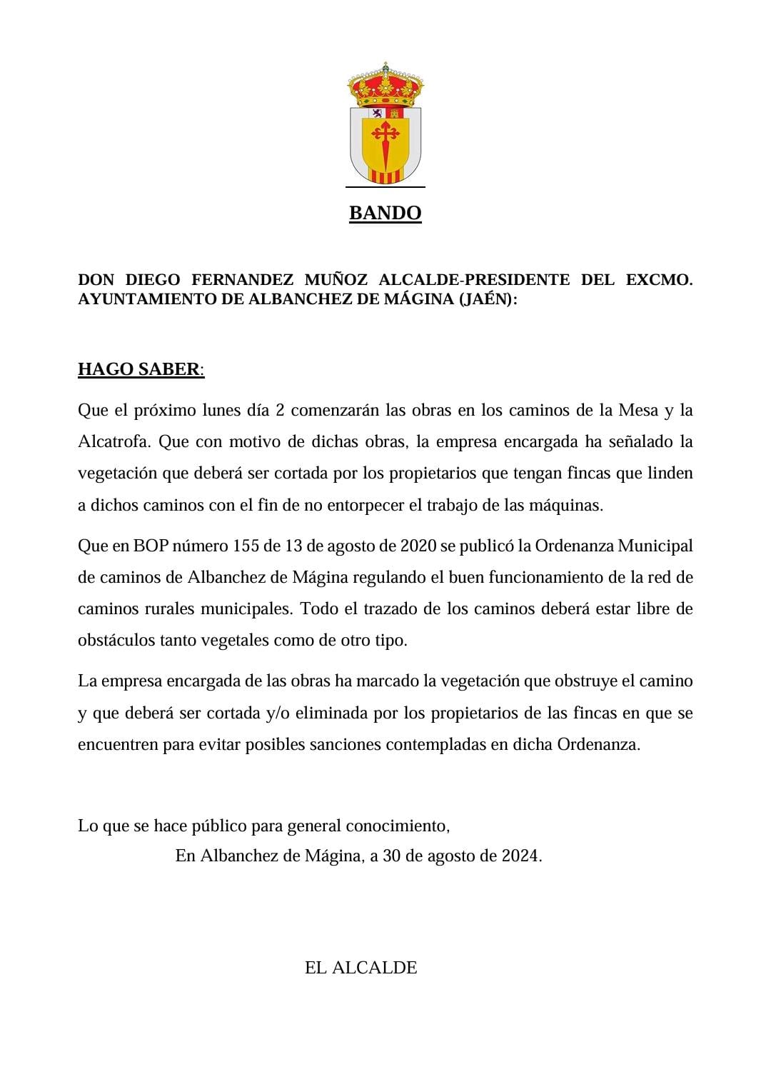 Saludos desde el Ayuntamiento. Se informa que se van a producir cortes en la carretera de la Mesa. Debido a las obras el camino puede quedar cortado durante largos periodos de tiempo. Disculpen las molestias.