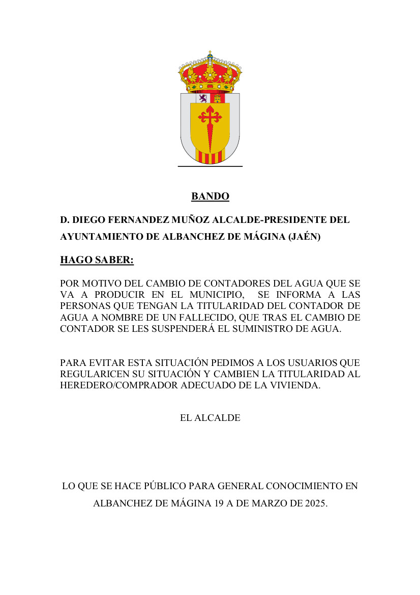 Saludos desde el Ayuntamiento. Por motivo de cambio de los contadores de agua, se informa de que todo domicilio que tenga el agua a nombre de un fallecido se quedara sin suministro. Por lo que se informa de […]