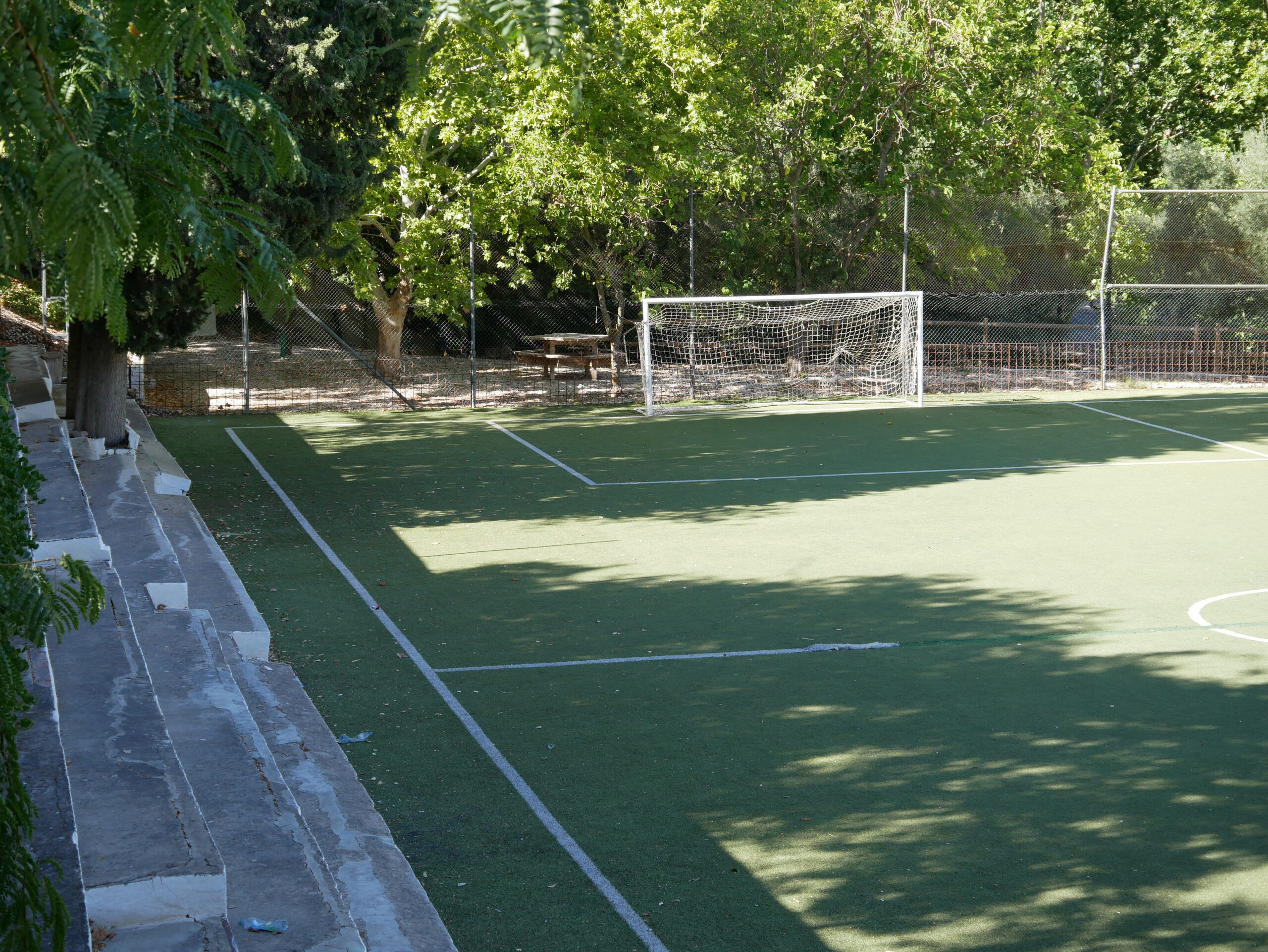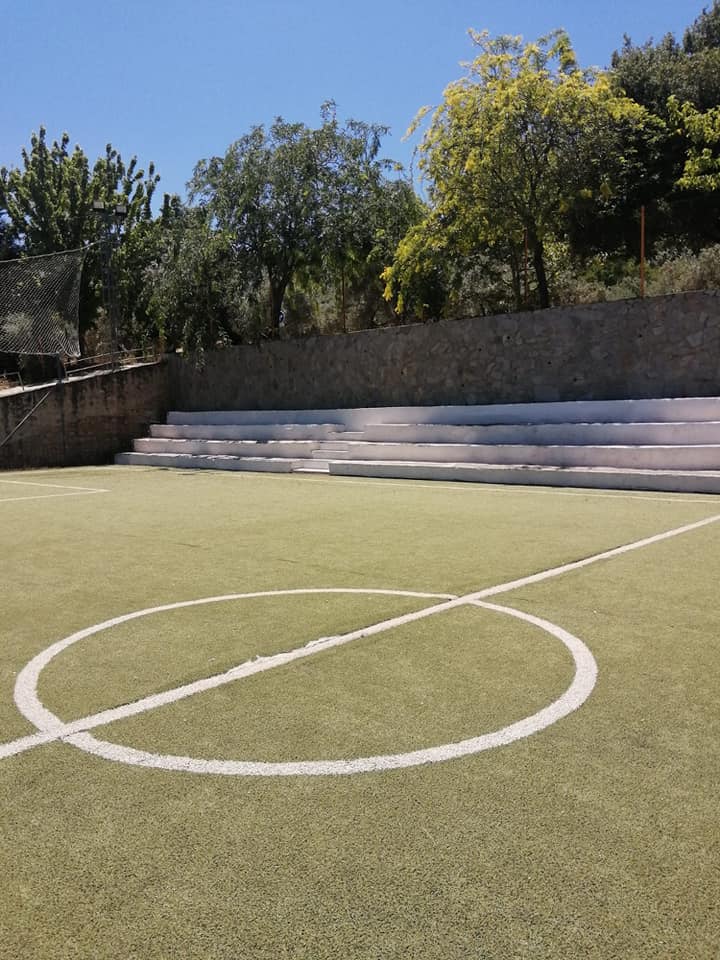 Dispone de amplias gradas. Donde se pueden alojar muchas personas como público, o para descansar entre partido y partido.