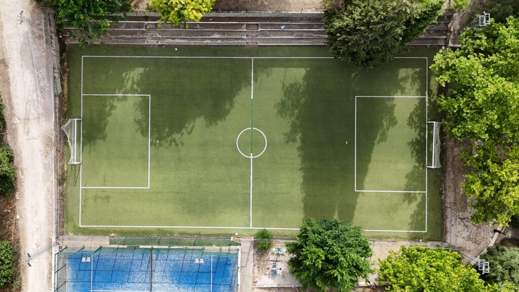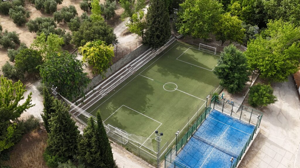 Pista de césped artificial. Muy cómodo y que evita daños graves al caerse.