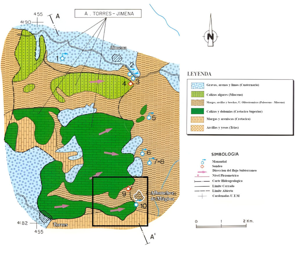 Las captaciones que nutren el sistema de agua potable en el municipio son: , Fuente los Siete Caños, Borbote y El Sondeo del Calvario. Estas se nutren de las aguas de la masa de agua denominada como M.A.S. 05.15 “Torres–Jimena».