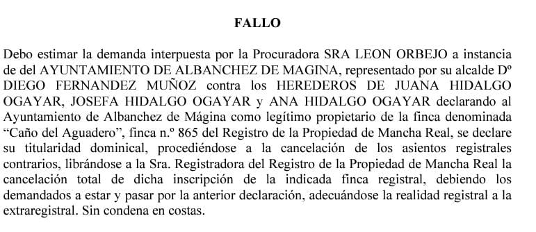 La finca del Caño del Aguaero pertenece al municipio de Albanchez de Mágina. Asi ha quedado ratificado por sentencia judicial.