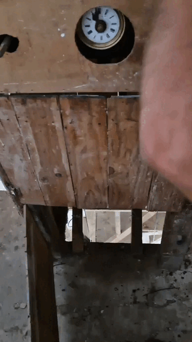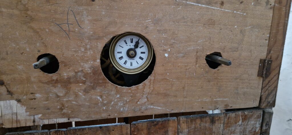 El mecanismo consta de dos parte, la izquierda para el reloj y la derecha para activar la campana que se encuentra en el tejado.