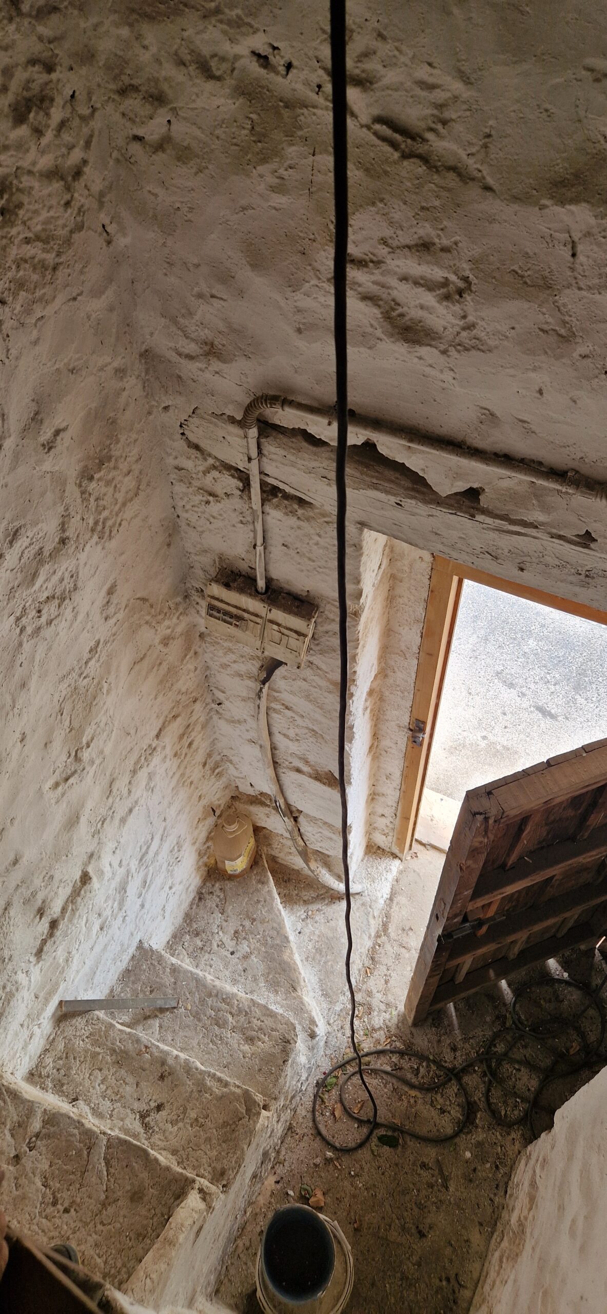 Algunos desperfectos eran: el mal estado de la puerta de acceso, gran cantidad de oxido en la estructura metálica, mal estado de las escaleras interiores, falta de electricidad, etc. Ademas de quitar la cal de las paredes, para dejarlo a piedra vista.