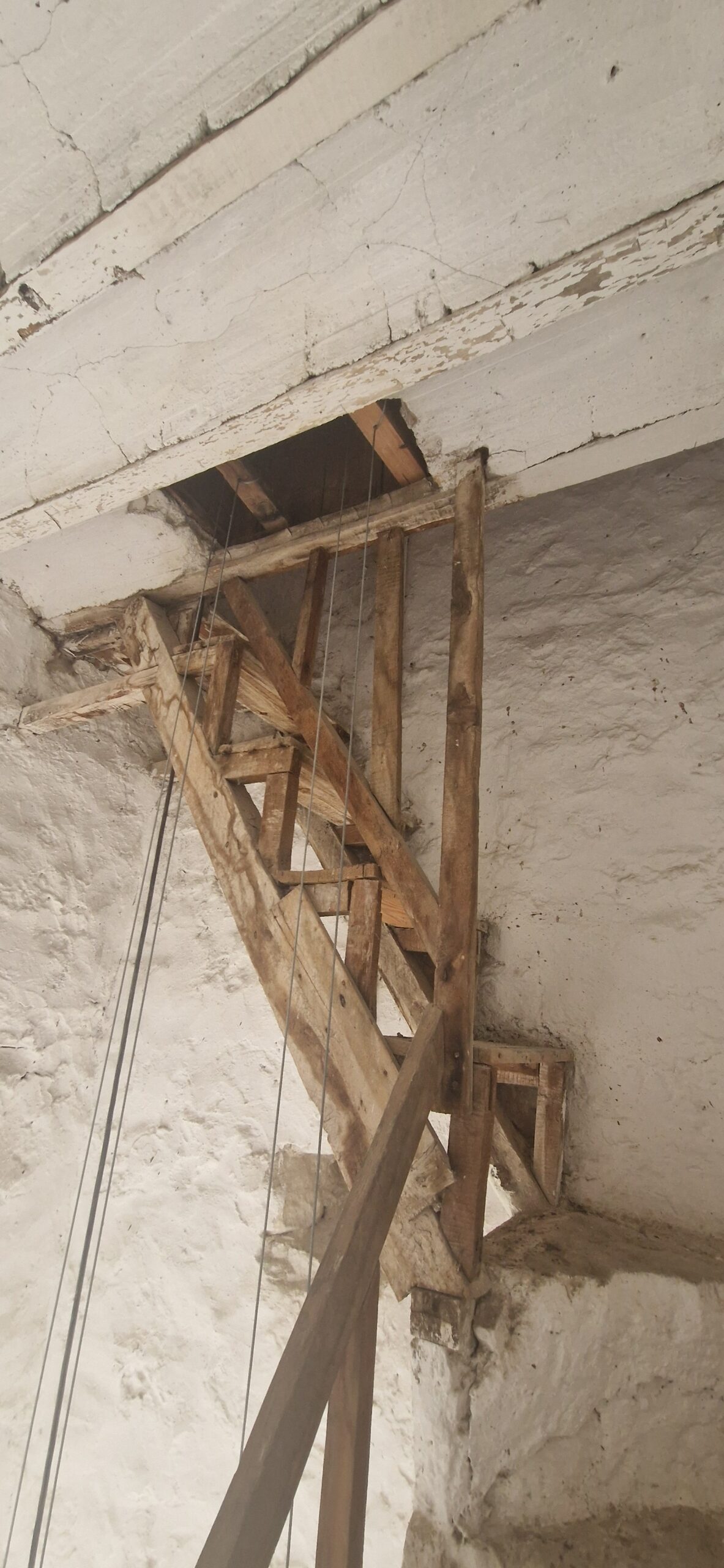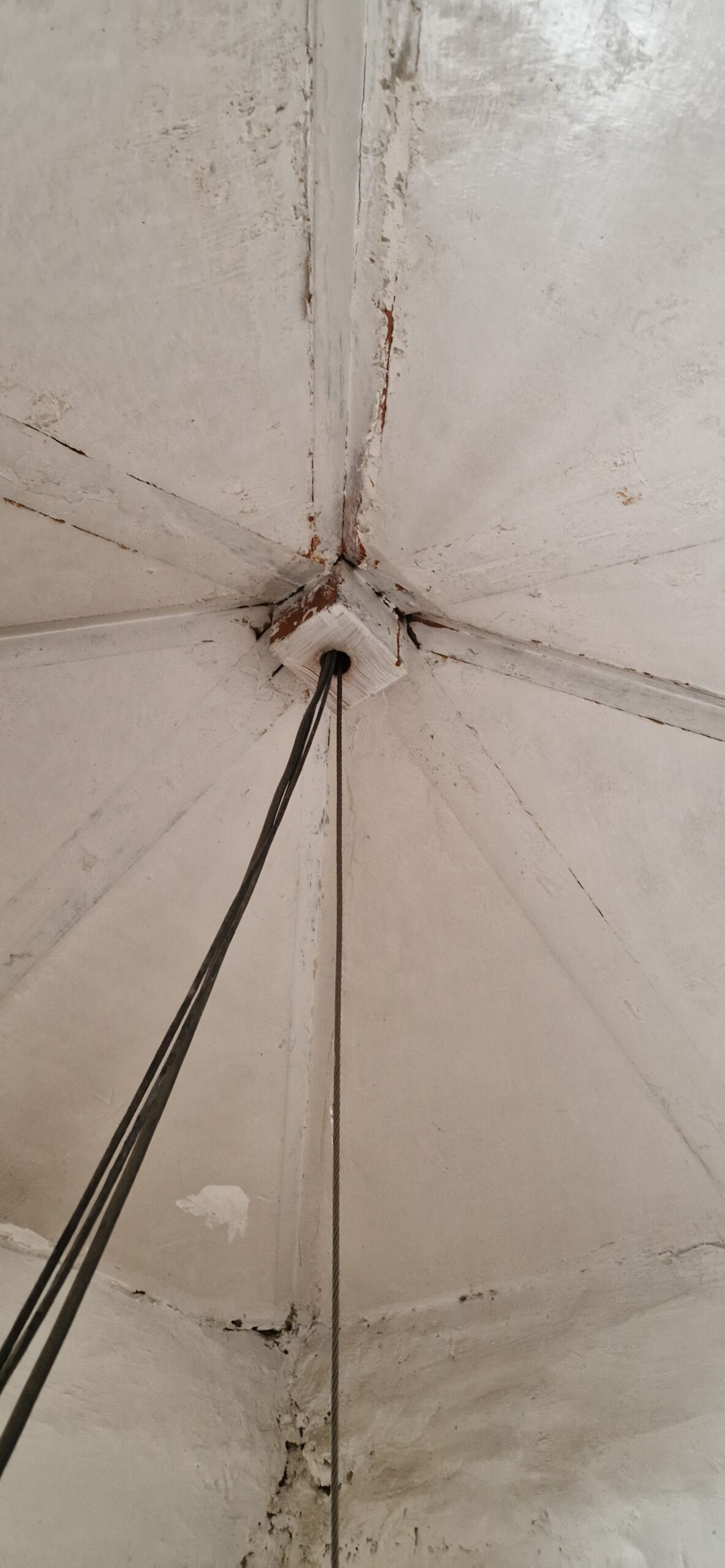 Destaca su mecanismo en la parte superior, sobre un entresuelo de madera. Allí se encuentra el mecanismo de el reloj. Este se encuentra conectado con un cable que sale por una abertura en el techo.