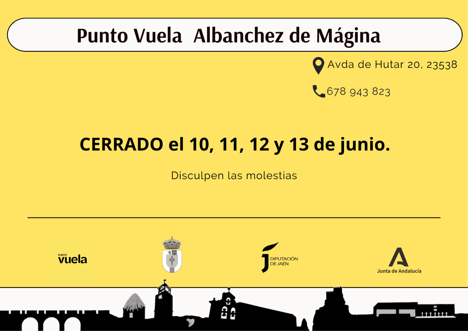 Buenos días desde el Ayuntamiento. Se informa de que el servicio de Punto Vuela (Antiguo Guadalinfo), durante los días 10 al 13 de Junio. Disculpen las molestias.