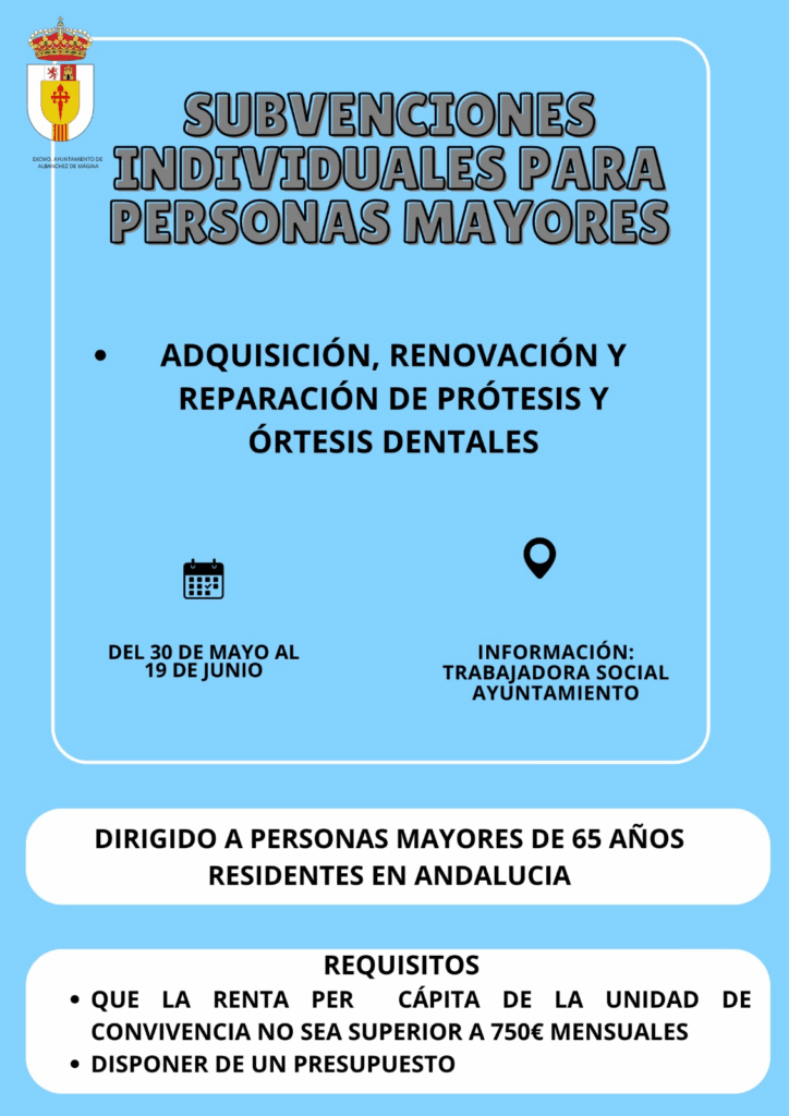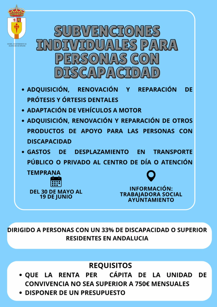 Saludos desde el Ayuntamiento. Se informa de que se abre el plazo para solicitar nuevas ayudas individuales. Consulta los requisitos pidiendo cita a la asistenta social en las oficinas del Ayuntamiento de 8:00 a 14:00. El plazo es del 30 de Mayo al 19 de Junio.